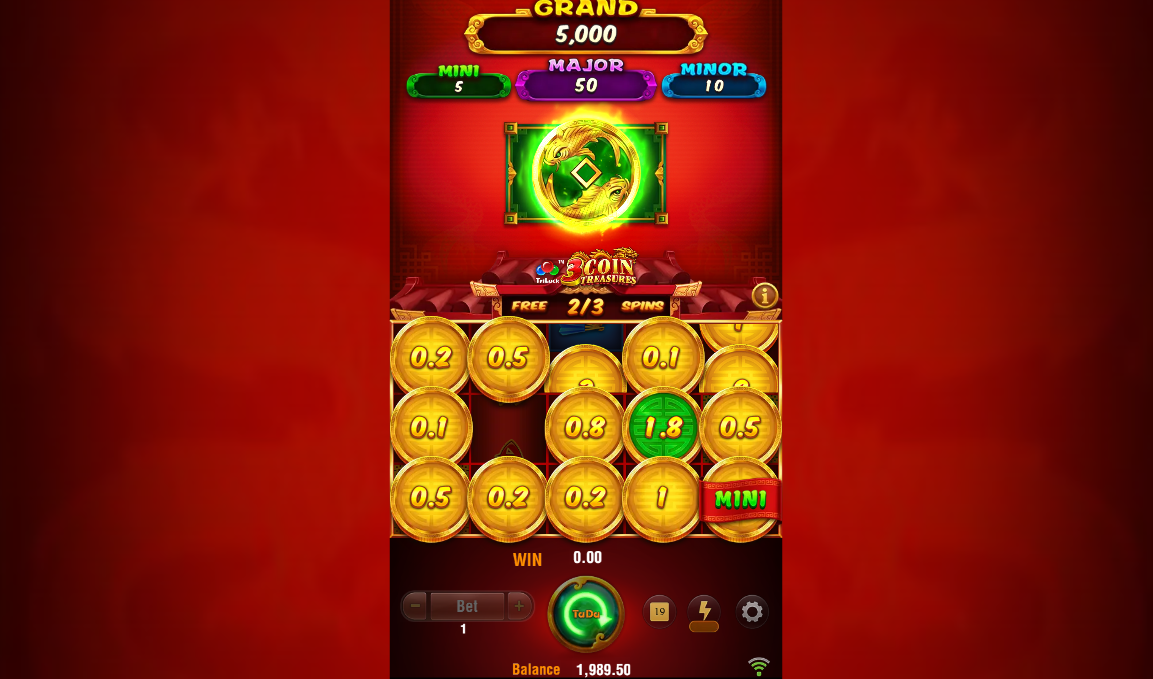 The gold coins carry cash values from 0.1x to 3x the total bet. The three coloured coins each add a distinct behaviour on top of that. The Tiger coin continuously flips to reveal bonus values. The Dragon coin doubles all other coin rewards when it appears. The Koi coin accumulates the values of all other coins on the grid, compounding whatever the others have built. When any single coin type fills every position on the grid, the Grand jackpot of 5,000x stake is awarded.