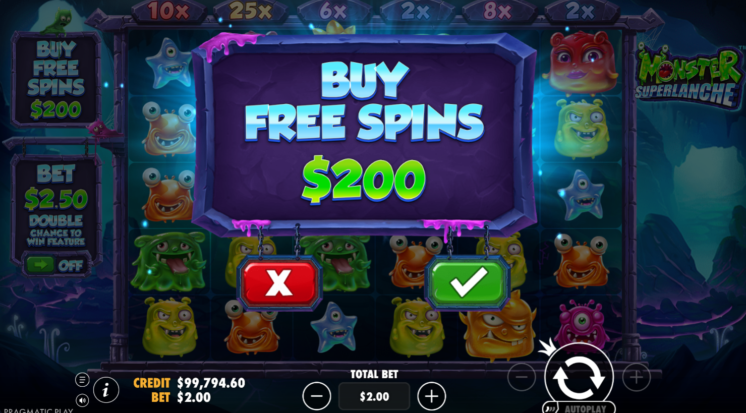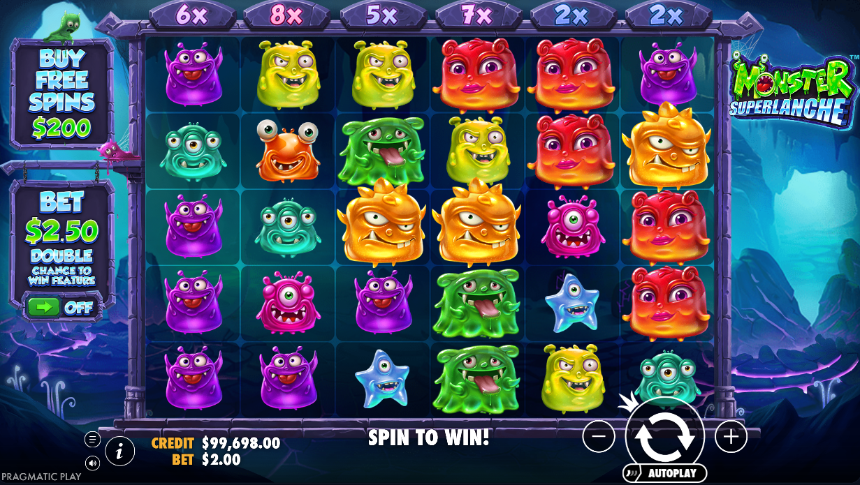 Monster Superlanche plays on a 6-reel, 5-row grid using scatter pays rather than fixed paylines.