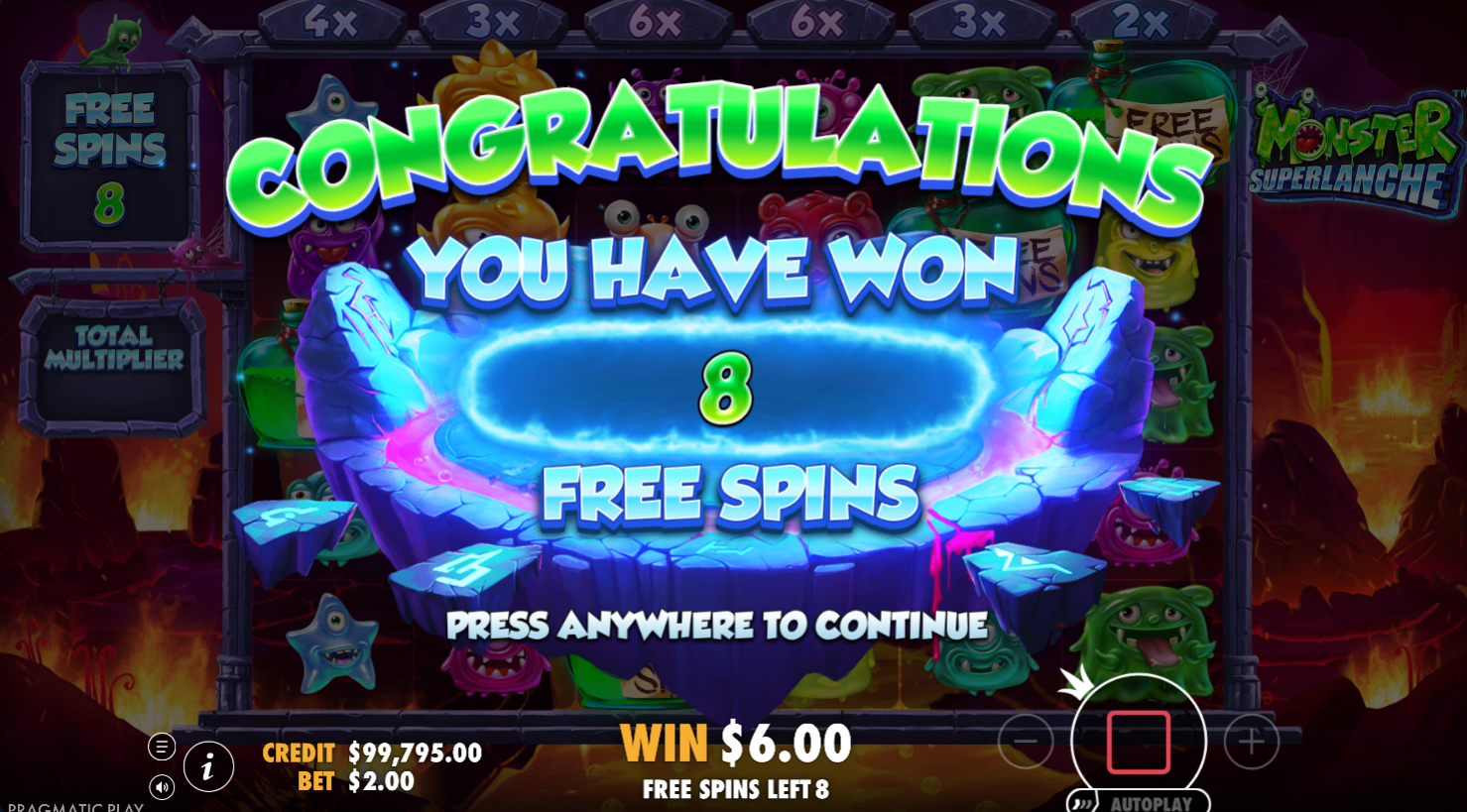 Triggering the free spins transforms the game visually. The calm cave backdrop shifts to a volcanic hellscape with lava and fire replacing the blues and purples. The soundtrack intensifies and the monsters look more agitated. It is a well-produced transition that makes the bonus feel like a distinct event rather than just more of the same. However, our bonus buy experience was deeply underwhelming. A $200 purchase at 100x returned $9, well below even a modest expectation. This is the reality of high volatility scatter pays at 5/5 rating, and while the maths allow for large wins when multipliers stack during the bonus, any individual round can be nearly empty.